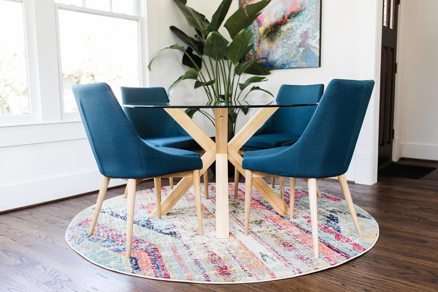 Upholstered in a high-density, twill-weave navy fabric, the chair offers a rich, tactile experience. The deep azure hue provides a bold contrast against light-filled rooms, grounding your decor with a sense of calm and luxury. Complementing the vibrant upholstery are the tapered solid wooden legs, finished in a natural, matte clear coat to showcase the authentic wood grain.